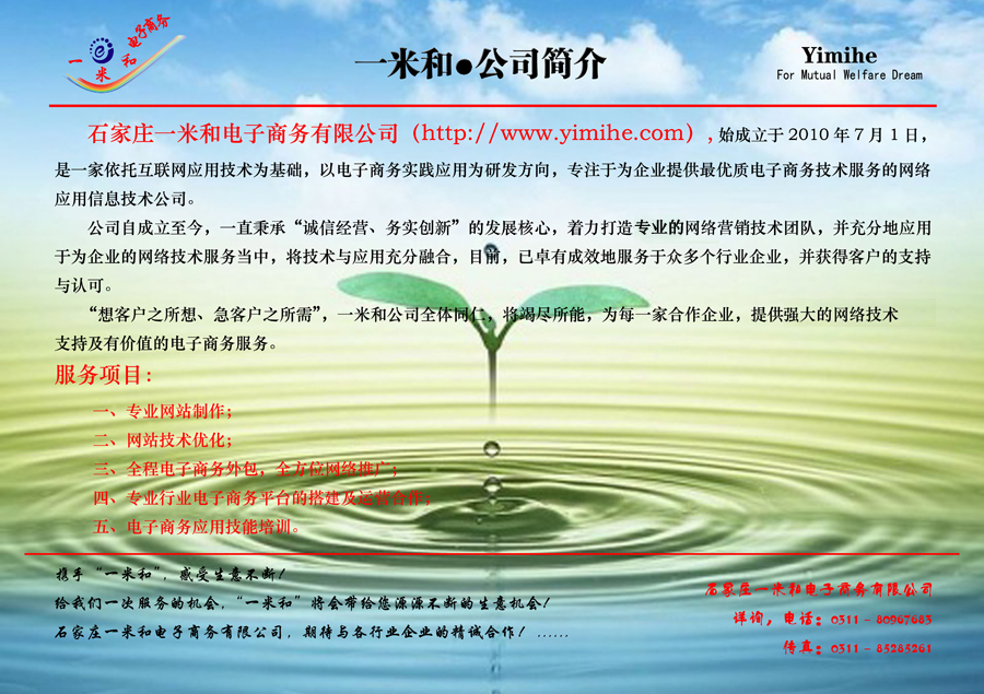 石家莊一米和電子商務(wù)有限公司(http://m.2z9z.com),始成立于2010年7月1日,是一家依托互聯(lián)網(wǎng)應(yīng)用技術(shù)為基礎(chǔ),以電子商務(wù)實踐應(yīng)用為研發(fā)方向,專注于為企業(yè)提供優(yōu)質(zhì)電子商務(wù)技術(shù)服務(wù)的網(wǎng)絡(luò)應(yīng)用信息技術(shù)公司。